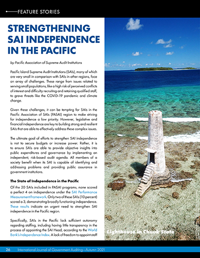 Pacific Island Supreme Audit Institutions (SAIs), many of which are very small in comparison with SAIs in other regions, face an array of challenges. These range from issues related to serving small populations, like a high risk of perceived conflicts of interest and difficulty recruiting and retaining qualified staff, to grave threats like the COVID-19 pandemic and climate change. Given these challenges, it can be tempting for SAIs in the Pacific Association of SAIs (PASAI) region to...