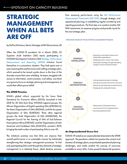 When the COVID-19 pandemic hit in March 2020, 22 Supreme Audit Institution (SAI) teams participating in INTOSAI Development Initiative’s (IDI) Strategy, Performance Measurement and Reporting (SPMR) initiative found themselves in a precarious situation. They had spent over a year assessing their performance and crafting a strategic plan, which seemed to be turned upside down in the face of...
