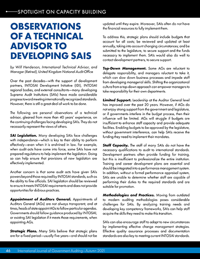 Over the past decades—with the support of development partners, INTOSAI Development Initiative (IDI), INTOSAI regional bodies, and external consultants—many developing Supreme Audit Institutions (SAIs) have made considerable progress toward meeting internationally recognized standards. However...