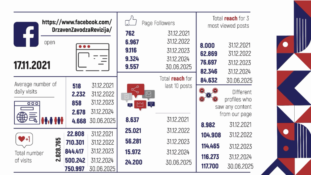 Transparency is a foundational value for SAO North Macedonia. Our updated Communication Strategy (2024–2027) promotes proactive dialogue with stakeholders—ranging from Parliament and the judiciary to civil society and the media. Currently, we reached more than 2,400 stakeholders through briefings, reports and digital platforms. Our social media presence expanded steadily, with our Facebook reach surpassing 2.5 billion visits since its establishment in November 2021 with more than 9,000 regular followers and website traffic exceeding 220,000 visits in the past year.