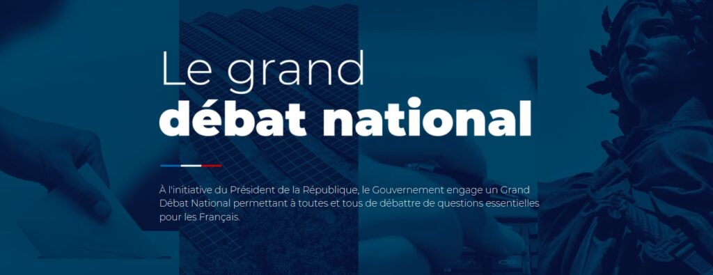 في مواجهة حركة احتجاجية على زيادة ضريبة الغاز ، اتخذت الحكومة الفرنسية إجراءات من خلال إطلاق National Grand Débat لتعزيز التبادل المباشر مع المواطنين. تم تصميم هذه المشاورة الوطنية لإلقاء الضوء على اهتمامات المواطنين في أربعة محاور رئيسية – التحول البيئي ، والضرائب ، والخدمات العامة ، والديمقراطية.