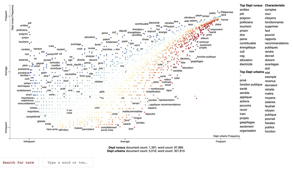 إن مجرد قراءة ملخصات Grand Débat لن يكون كافياً – فقد أراد المعهد الفرنسي الأعلى للرقابة المالية (SAI) معرفة المزيد. طور مركز الدعم الفني ، الذي يديره قسم المنهجية وتحليل البيانات ، منهجية لتحليل النتائج. كان الهدف بسيطًا: فهم توقعات المواطنين من الجهاز.
