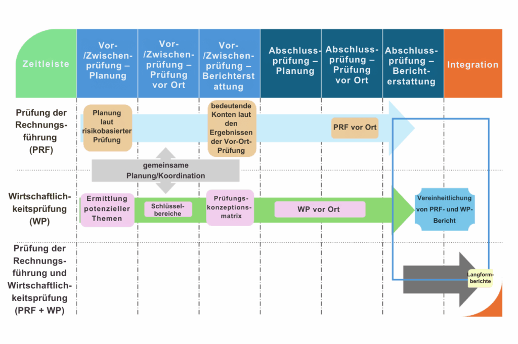 Eine weitere Herausforderung ergibt sich aus den unterschiedlichen Zeitrahmen von Prüfungen der Rechnungsführung und Wirtschaftlichkeitsprüfungen. Prüfungen der Rechnungsführung folgen in der Regel einem Jahreszyklus. Dabei führt das Prüfungspersonal einmal pro Finanzjahr eine vollständige Überprüfung des Rechnungsabschlusses einer Einrichtung durch. Wirtschaftlichkeitsprüfungen hingegen dienen der Beurteilung von Programmen sowie Tätigkeiten, die oft einen Zeitraum von über zwei Jahren umfassen, und erfordern eine umfangreiche Planung sowie die regelmäßige Neubeurteilung der Risiken. Diese zeitliche Diskrepanz führt zu erheblichen Herausforderungen in Bezug auf die Koordination, wenn Prüfteams zusammengebracht werden. Um den oben genannten Herausforderungen zu begegnen und die Ergebnisse aus beiden Perspektiven zu optimieren, brachten wir den integrierten FAPA-Workflow ein, der in der nachfolgenden Abbildung dargestellt ist.