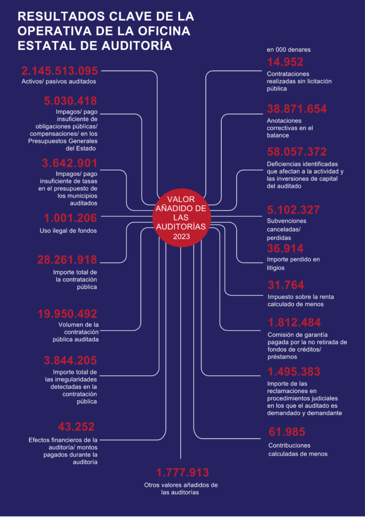 Uno de los pilares básicos de nuestra labor es el concepto de valor añadido. En 2023, nuestras auditorías sacaron a la luz más de 5.000 millones de denares en obligaciones impagadas o insuficientemente pagadas en detrimento de los Presupuestos Generales, junto con 3.600 millones de denares que afectaban a las arcas a nivel municipal. Por otra parte, nuestros hallazgos revelaron irregularidades en la contratación pública por valor de más de 3.800 millones de denares y un uso ilegal de fondos superior a 1.000 millones de denares. Estos datos, además de evidenciar una serie de ineficiencias, demuestran el enorme potencial transformador de las intervenciones de auditoría cuando van acompañadas de una capacidad de respuesta institucional.