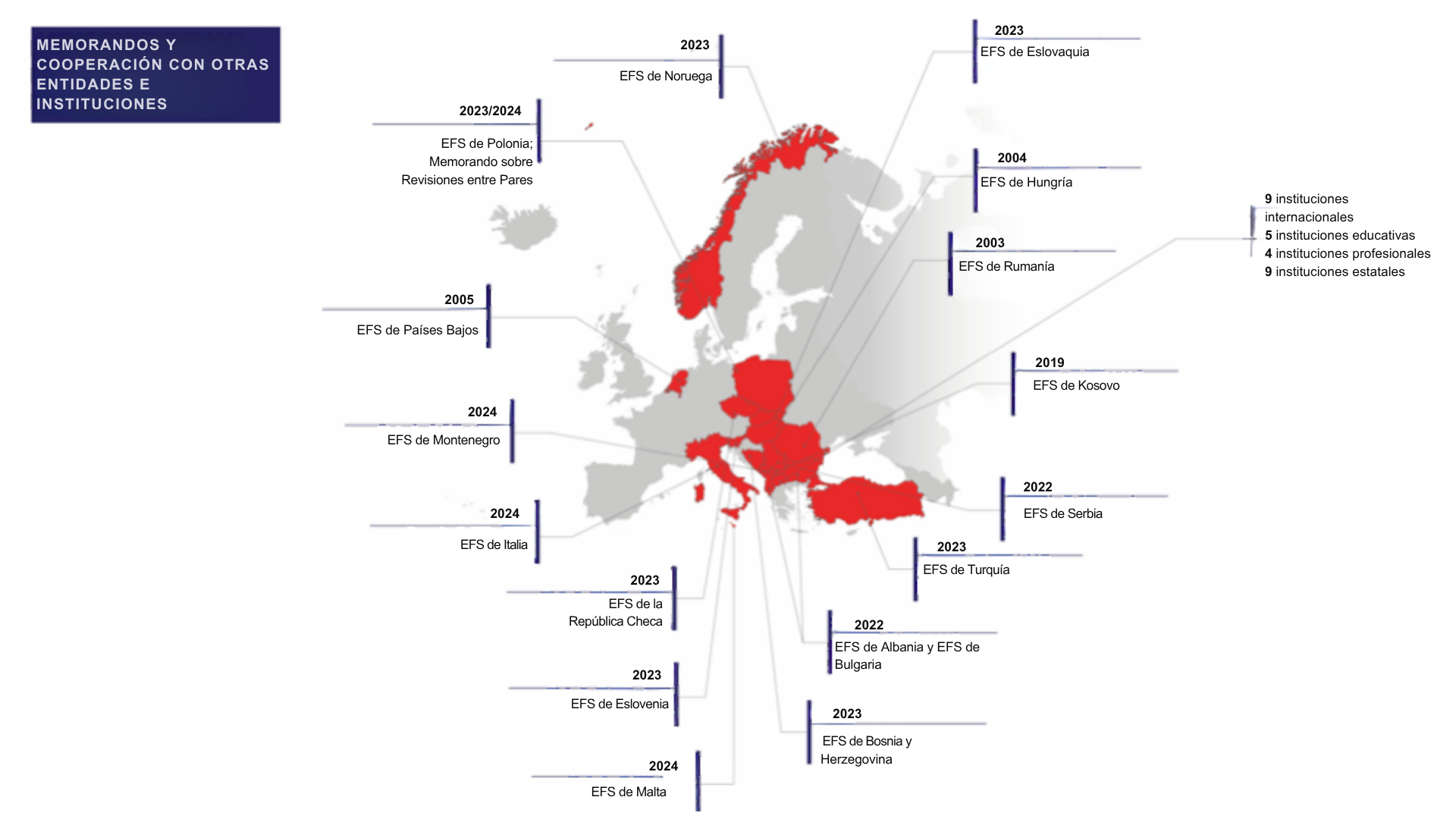 La EFS de la República de Macedonia del Norte participa activamente en las comunidades INTOSAI y EUROSAI, y ha firmado 43 memorandos de cooperación con otras Entidades Fiscalizadoras Superiores e instituciones internacionales, profesionales, educativas y gubernamentales, reforzando así las asociaciones y promoviendo el intercambio de conocimientos y mejores prácticas.
