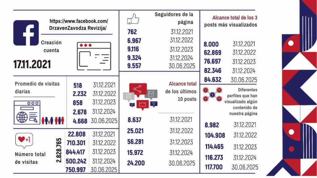 La transparencia es uno de los valores fundacionales de la EFS de Macedonia del Norte. Nuestra Estrategia de Comunicación actualizada (2024-2027) promueve el diálogo proactivo con las partes interesadas, desde el Parlamento y el poder judicial hasta la sociedad civil y los medios de comunicación. A día de hoy, llegamos a más de 2.400 partes interesadas a través de briefings, informes y plataformas digitales. Nuestra presencia en las redes sociales ha ido en constante aumento, con un alcance en Facebook de más de 2.500 millones de visitas desde la creación de la cuenta en noviembre de 2021, con más de 9.000 seguidores habituales y con un tráfico en el sitio web que superó las 220.000 visitas el año pasado.