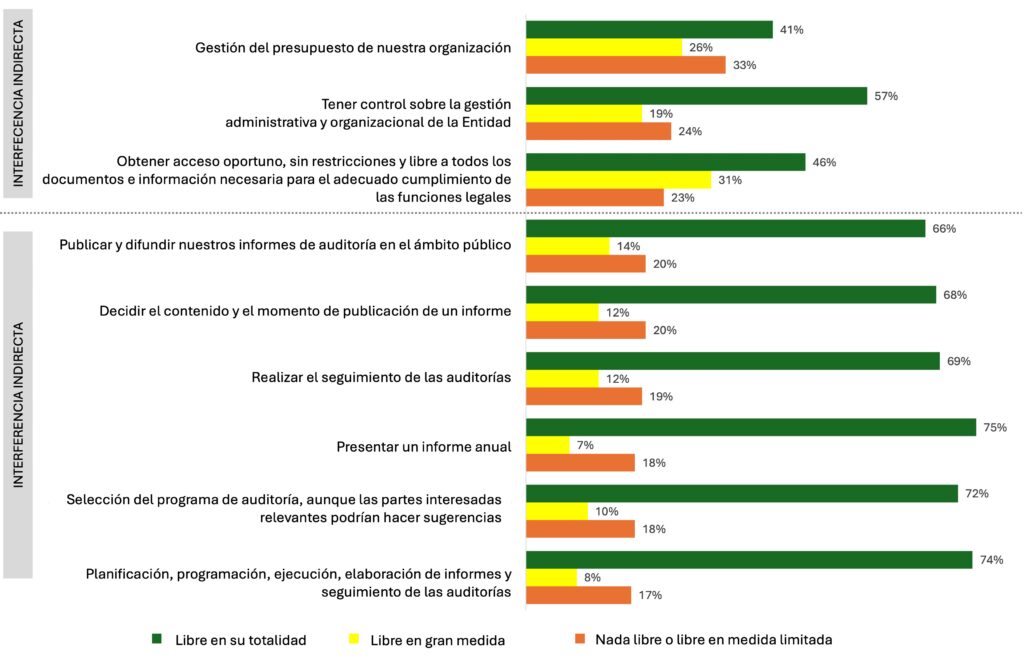 Actualmente este informe ofrece la evaluación más completa sobre el desempeño de las EFS que existe en el mundo, siendo particularmente interesante para este análisis la Pregunta 13 (obtuvo 166 respuestas) que indagó sobre en qué medida las EFS estuvieron libres de interferencia del Legislativo o del Ejecutivo en sus actividades sustantivas durante el periodo 2020–2022. Estimamos que esta pregunta traslada el debate desde principios normativos abstractos hacia situaciones concretas donde la independencia se ve vulnerada permitiendo visualizar cómo la interferencia afecta a las EFS en la práctica. Esta pregunta distingue nueve actividades esenciales en las que las EFS pueden sufrir interferencia, las que pueden agruparse analíticamente en formas directas e indirectas.