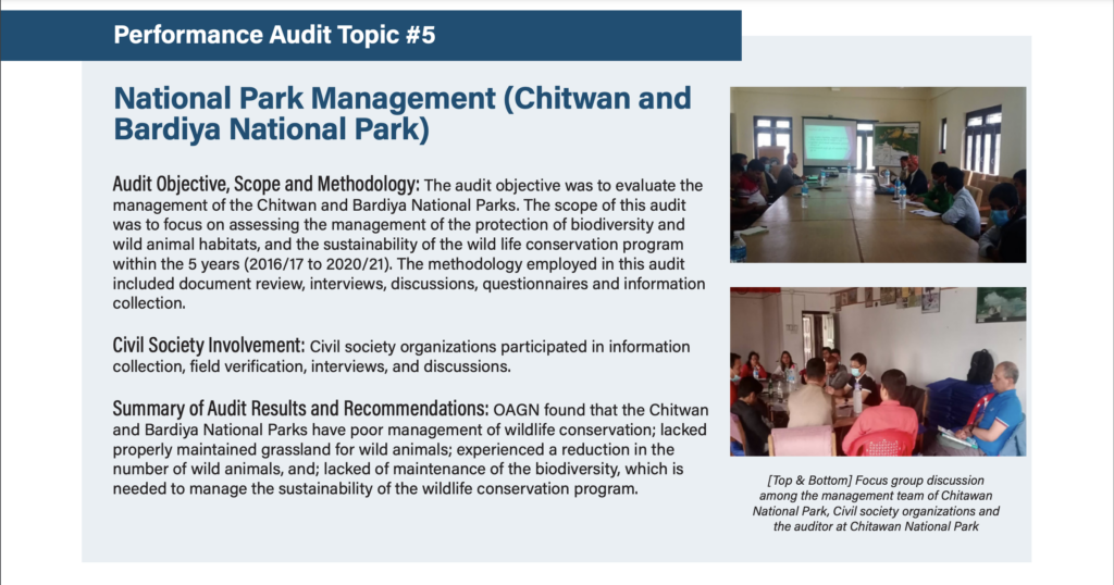 Resumen de los resultados y las recomendaciones de la auditoría: la OAGN detectó que los Parques Nacionales de Chitwan y Bardiya sufren una gestión deficiente en materia de conservación de la vida silvestre; carecen de pastizales debidamente mantenidos para la fauna silvestre; experimentan una reducción en el número de especies salvajes; y no mantienen la biodiversidad, lo que resulta imprescindible en aras de la sostenibilidad de un programa de conservación de la vida silvestre.